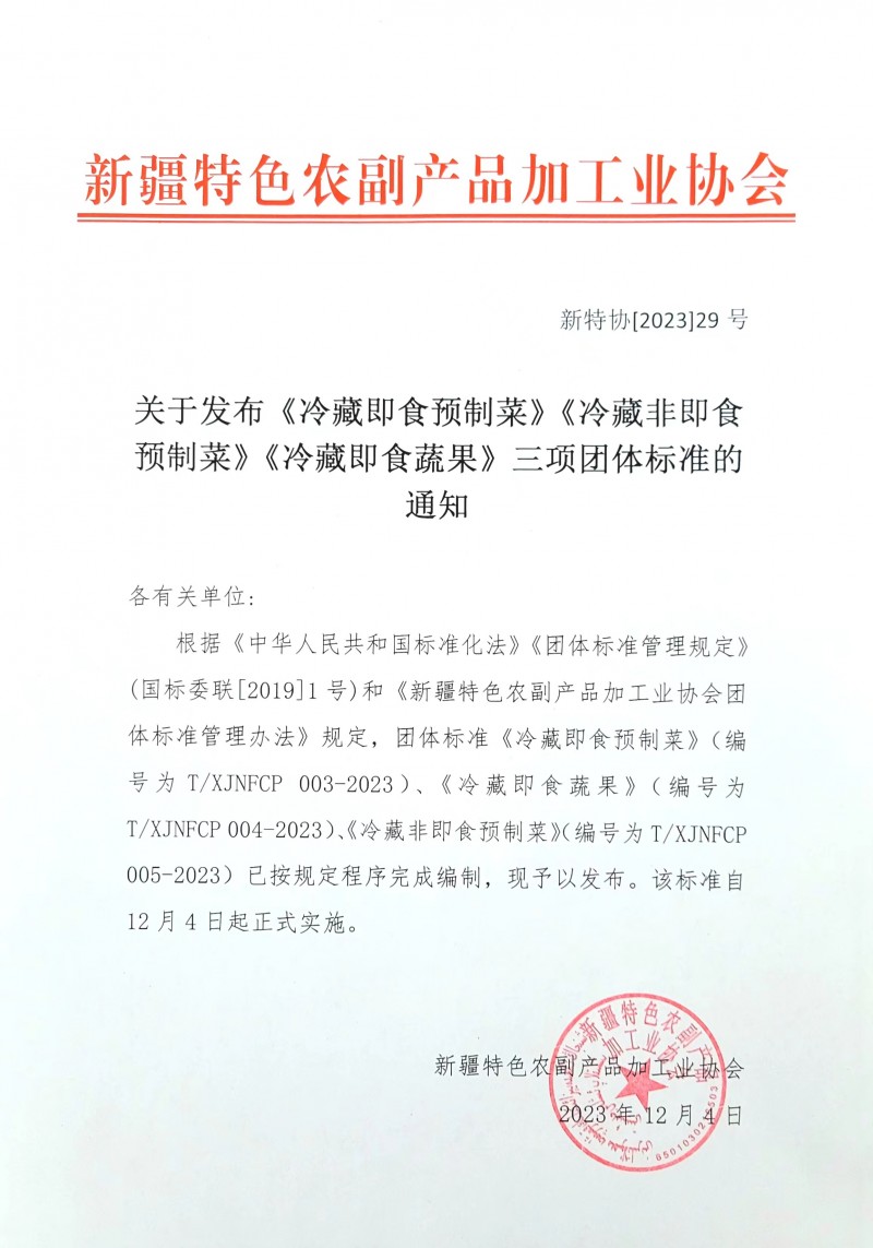 根據(jù)《中華人民共和國(guó)標(biāo)準(zhǔn)化法》《團(tuán)體標(biāo)準(zhǔn)管理規(guī)定》(國(guó)標(biāo)委聯(lián)[2019]1號(hào))和《新疆特色農(nóng)副產(chǎn)品加工業(yè)協(xié)會(huì)團(tuán)體標(biāo)準(zhǔn)管理辦法》規(guī)定,團(tuán)體標(biāo)準(zhǔn)《冷藏即食預(yù)制菜》(編號(hào)為T/XJNFCP 003-2023)、《冷藏即食蔬果》(編號(hào)為T/XJNFCP 004-2023)、《冷藏非即食預(yù)制菜》(編號(hào)為T/XJNFCP 005-2023)已按規(guī)定程序完成編制,現(xiàn)予以發(fā)布。該標(biāo)準(zhǔn)自12月4日起正式實(shí)施。