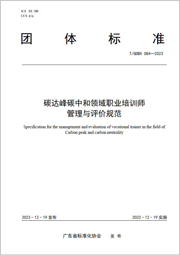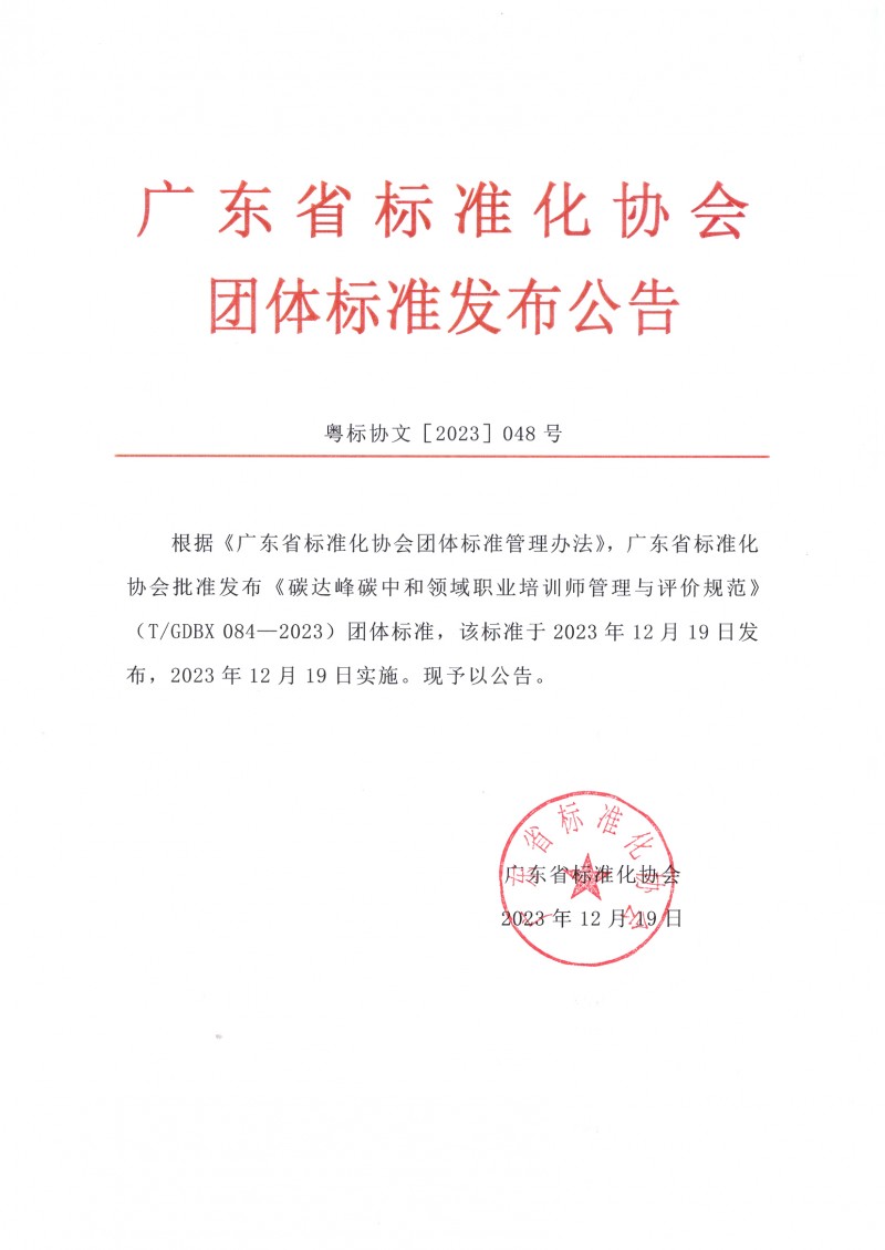 根據《廣東省標準化協會團體標準管理辦法》,廣東省標準化協會批準發布《碳達峰碳中和領域職業培訓師管理與評價規范》(T/GDBX 084—2023)團體標準,該標準于2023年12月19日發布,2023年12月19日實施。現予以公告。