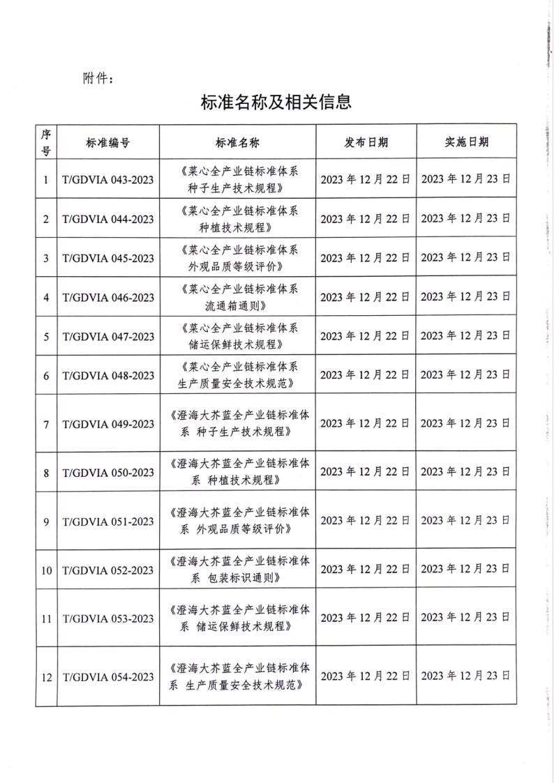 相關(guān)標(biāo)準(zhǔn)如下:T/GDVIA 043-2023 菜心全產(chǎn)業(yè)鏈標(biāo)準(zhǔn)體系 種子生產(chǎn)技術(shù)規(guī)程 T/GDVIA 044-2023 菜心全產(chǎn)業(yè)鏈標(biāo)準(zhǔn)體系 種植技術(shù)規(guī)程 T/GDVIA 045-2023 菜心全產(chǎn)業(yè)鏈標(biāo)準(zhǔn)體系 外觀品質(zhì)等級(jí)評(píng)價(jià) T/GDVIA 046-2023 菜心全產(chǎn)業(yè)鏈標(biāo)準(zhǔn)體系 流通箱通則 T/GDVIA 047-2023 菜心全產(chǎn)業(yè)鏈標(biāo)準(zhǔn)體系 儲(chǔ)運(yùn)保鮮技術(shù)規(guī)程 T/GDVIA 048-2023 菜心全產(chǎn)業(yè)鏈標(biāo)準(zhǔn)體系 生產(chǎn)質(zhì)量安全技術(shù)規(guī)范 T/GDVIA 049-2023 澄海大芥藍(lán)全產(chǎn)業(yè)鏈標(biāo)準(zhǔn)體系 種子生產(chǎn)技術(shù)規(guī)程 T/GDVIA 050-2023 澄海大芥藍(lán)全產(chǎn)業(yè)鏈標(biāo)準(zhǔn)體系 種植技術(shù)規(guī)程 T/GDVIA 051-2023 澄海大芥藍(lán)全產(chǎn)業(yè)鏈標(biāo)準(zhǔn)體系 外觀品質(zhì)等級(jí)評(píng)價(jià) T/GDVIA 052-2023 澄海大芥藍(lán)全產(chǎn)業(yè)鏈標(biāo)準(zhǔn)體系 包裝標(biāo)識(shí)通則 T/GDVIA 053-2023 澄海大芥藍(lán)全產(chǎn)業(yè)鏈標(biāo)準(zhǔn)體系 儲(chǔ)運(yùn)保鮮技術(shù)規(guī)程 T/GDVIA 054-2023 澄海大芥藍(lán)全產(chǎn)業(yè)鏈標(biāo)準(zhǔn)體系 生產(chǎn)質(zhì)量安全技術(shù)規(guī)范