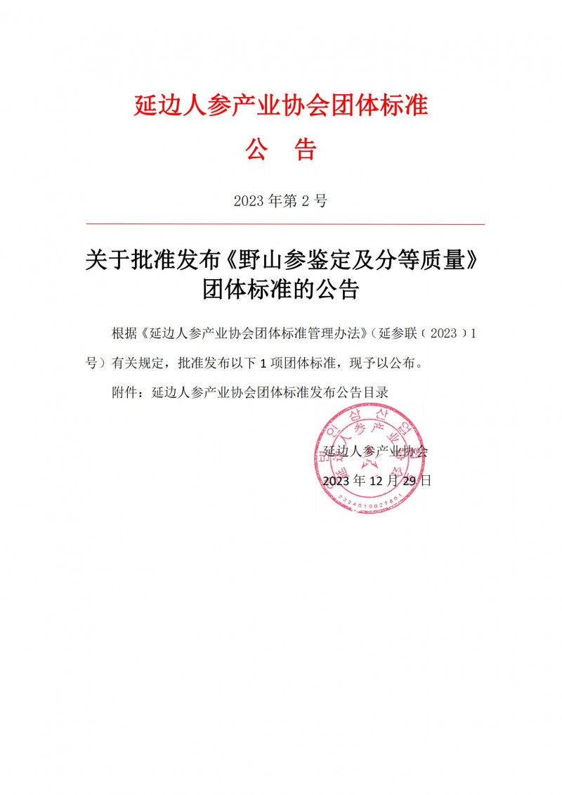 根據(jù)《延邊人參產(chǎn)業(yè)協(xié)會(huì)團(tuán)體標(biāo)準(zhǔn)管理辦法》(延參聯(lián)﹝2023﹞1號(hào))有關(guān)規(guī)定,批準(zhǔn)發(fā)布以下1項(xiàng)團(tuán)體標(biāo)準(zhǔn),現(xiàn)予以公布。