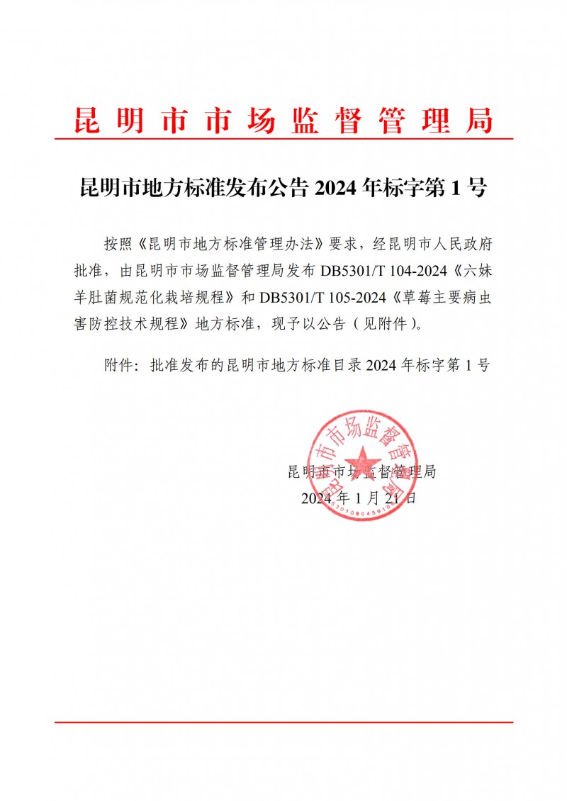 | DB5301/T 104-2024 | 《六妹羊肚菌規范化栽培規程》 | 2024年3月15日 | 2024年4月15日 | |