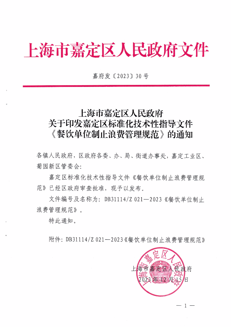 嘉定區(qū)標(biāo)準(zhǔn)化技術(shù)性指導(dǎo)文件《餐飲單位制止浪費(fèi)管理規(guī)范》已經(jīng)區(qū)政府審查批準(zhǔn),現(xiàn)予以發(fā)布。