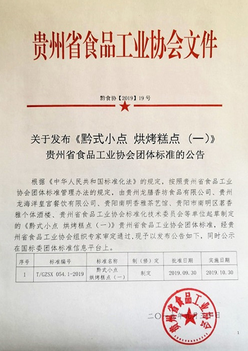 | 1 | T/GZSX 054.1-2019 | 黔式小點烘烤糕點(一) | 制定 | 2019.09.30 | 2019.10.30 |