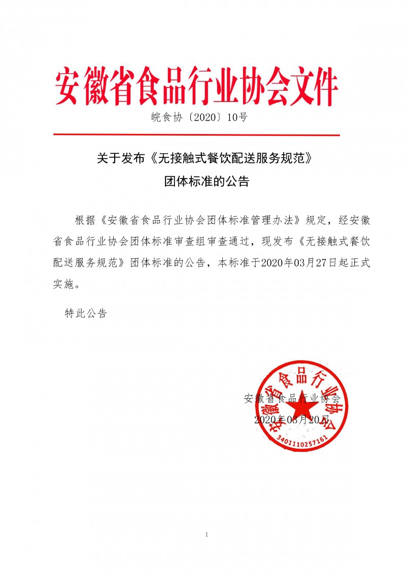 以上為安徽省食品行業(yè)協(xié)會(huì)關(guān)于發(fā)布《無(wú)接觸式餐飲配送服務(wù)規(guī)范》 團(tuán)體標(biāo)準(zhǔn)的公告(皖食協(xié)〔2020〕10號(hào))的檢測(cè)服務(wù)介紹,如有其他疑問可聯(lián)系在線工程師!