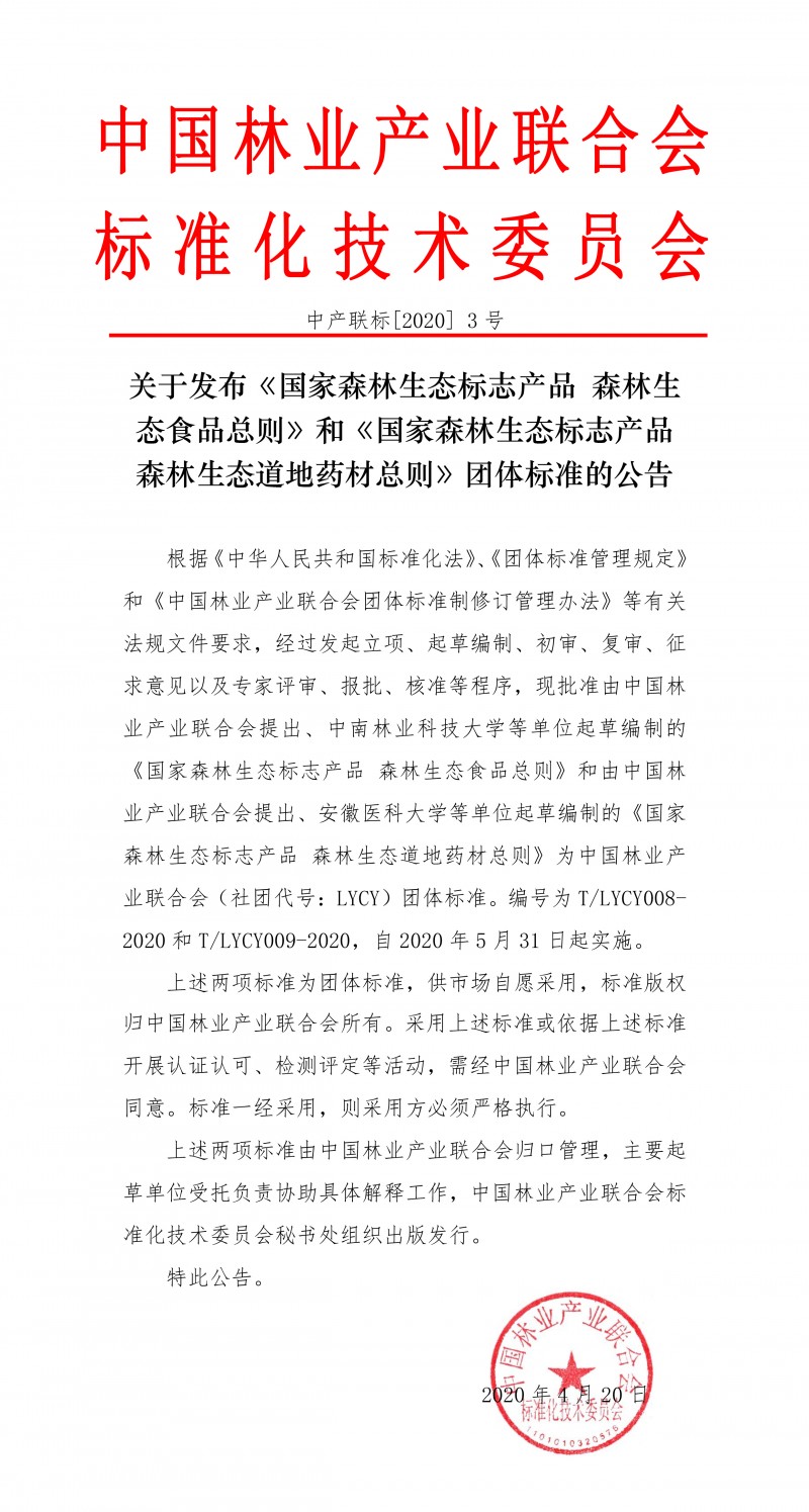 以上為中國林業產業聯合會關于發布《國家森林生態標志產品 森林生態食品總則》和《國家森林生態標志產品 森林生態道地藥材總則》團體標準的公告(中產聯標[2020] 3號)的檢測服務介紹,如有其他疑問可聯系在線工程師!