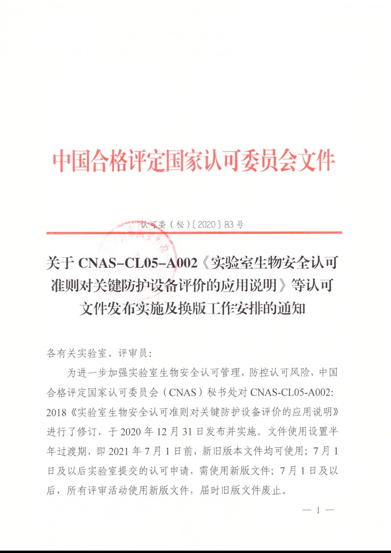 以上為中國合格評定國家認可委員會關于CNAS-CL05-A002《實驗室生物安全認可準則對關鍵防護設備評價的應用說明》等認可文件發布實施及換版工作安排的通知(認可委(秘)〔2020〕83號)的檢測服務介紹,如有其他疑問可聯系在線工程師!