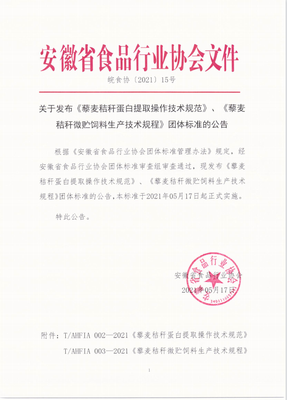 T/AHFIA 002-2021 藜麥秸稈蛋白提取操作技術規范 T/AHFIA 003-2021 藜麥秸稈微貯飼料生產技術規程