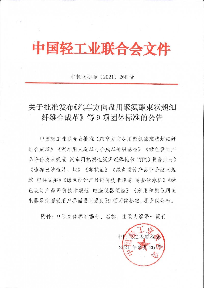 中國(guó)輕工業(yè)聯(lián)合會(huì)關(guān)于批準(zhǔn)發(fā)布《速凍巴沙魚片、塊》等9項(xiàng)團(tuán)體標(biāo)準(zhǔn)的公告(中輕聯(lián)標(biāo)準(zhǔn)[2021]268號(hào))