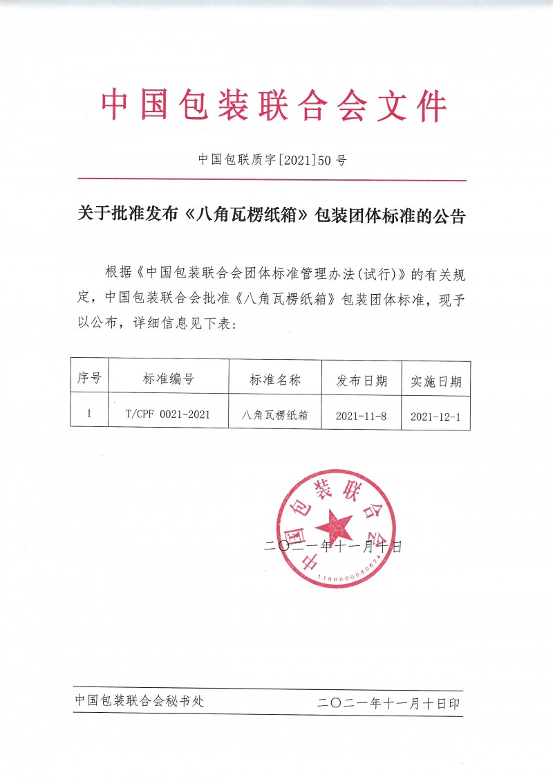 以上為中國包裝聯合會關于批準發布《八角瓦楞紙箱》包裝團體標準的公告(中國包聯質字[2021]50號)的檢測服務介紹,如有其他疑問可聯系在線工程師!