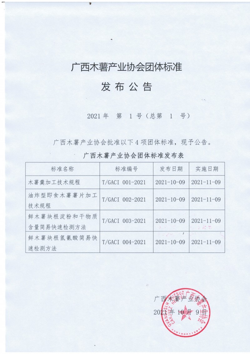| 木薯羹加工技術規程 | T/GACI 001-2021 | 2021-10-09 | 2021-11-09 |