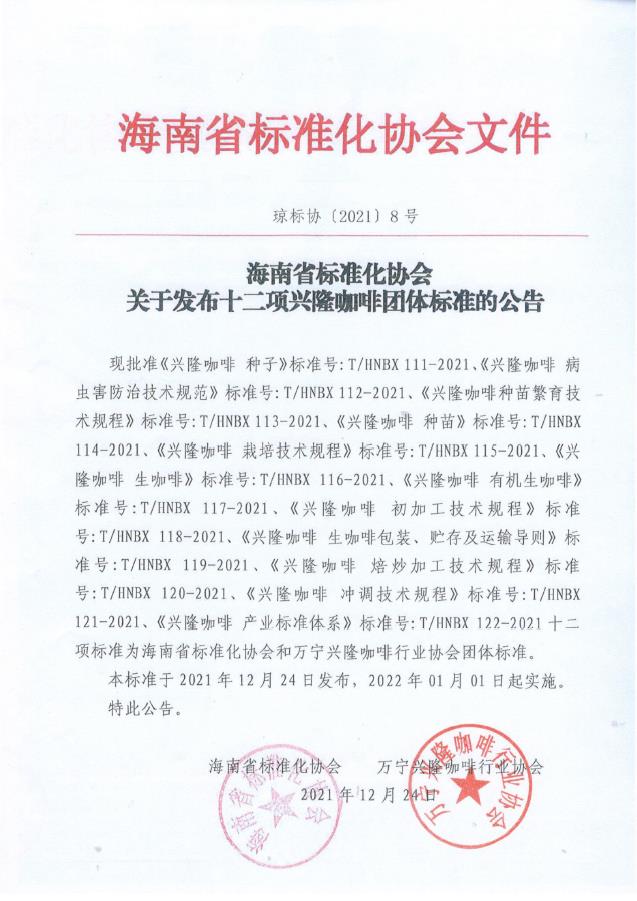 現批準《興隆咖啡 種子》,標準號:T/HNBX 111-2021;《興隆咖啡 病蟲害防治技術規范》,標準號:T/HNBX 112-2021;《興隆咖啡 種苗繁育技術規程》,標準號:T/HNBX 113-2021;《興隆咖啡 種苗》,標準號:T/HNBX 114-2021;《興隆咖啡 栽培技術規程》,標準號:T/HNBX 115-2021;《興隆咖啡 生咖啡》,標準號:T/HNBX 116-2021;《興隆咖啡 有機生咖啡》,標準號:T/HNBX 117-2021;《興隆咖啡 初加工技術規程》,標準號:T/HNBX 118-2021;《興隆咖啡 生咖啡包裝、貯存及運輸導則》,標準號:T/HNBX 119-2021;《興隆咖啡 焙炒加工技術規程》,標準號:T/HNBX 120-2021;《興隆咖啡 沖調技術規程》,標準號:T/HNBX 121-2021;《興隆咖啡 產業標準體系》,標準號:T/HNBX 122-2021十二項標準為海南省標準化協會和萬寧興隆咖啡行業協會團體標準。