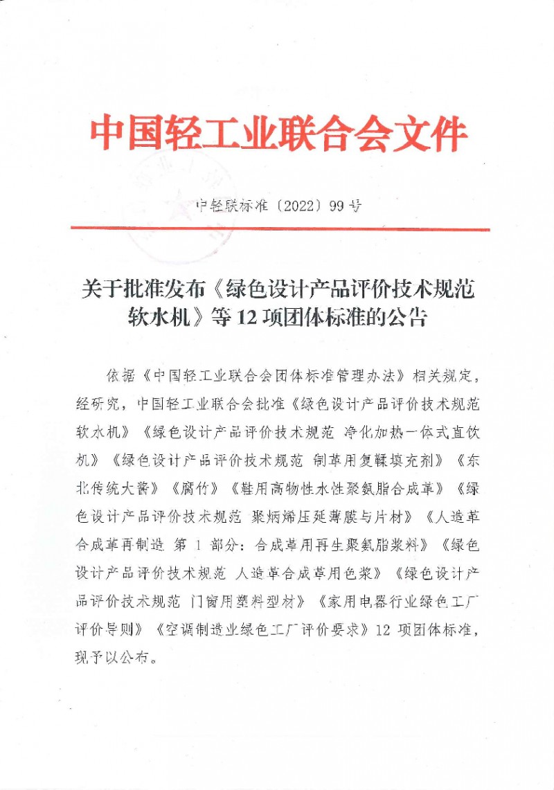 以上為中國輕工業聯合會關于批準發布《綠色設計產品評價技術規范 軟水機》等12項團體標準的公告(中輕聯標準[2022]99號)的檢測服務介紹,如有其他疑問可聯系在線工程師!