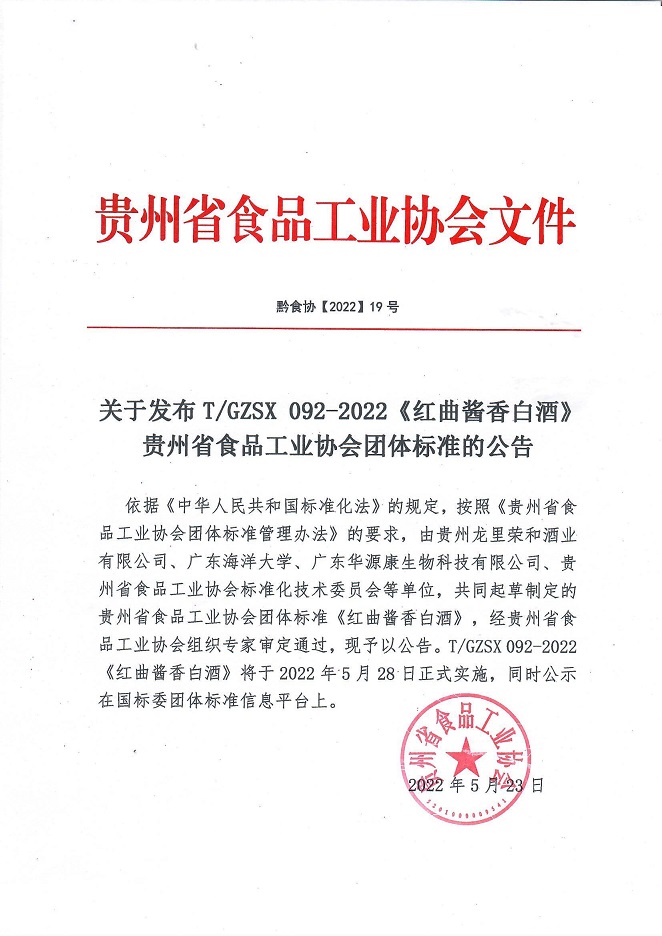 依據(jù)《中華人民共和國(guó)標(biāo)準(zhǔn)化法》的規(guī)定,按照《貴州省食品工業(yè)協(xié)會(huì)團(tuán)體標(biāo)準(zhǔn)管理辦法》的要求,由貴州龍里榮和酒業(yè)有限公司、廣東海洋大學(xué)、廣東華源康生物科技有限公司、貴州省食品工業(yè)協(xié)會(huì)標(biāo)準(zhǔn)化技術(shù)委員會(huì)等單位,共同起草制定的貴州省食品工業(yè)協(xié)會(huì)團(tuán)體標(biāo)準(zhǔn)《紅曲醬香白酒》,經(jīng)貴州省食品工業(yè)協(xié)會(huì)組織專家審定通過,現(xiàn)予以公告。T/GZSX 092-2022《紅曲醬香白酒》將于2022年5月28日正式實(shí)施,同時(shí)公示在國(guó)標(biāo)委團(tuán)體標(biāo)準(zhǔn)信息平臺(tái)上。