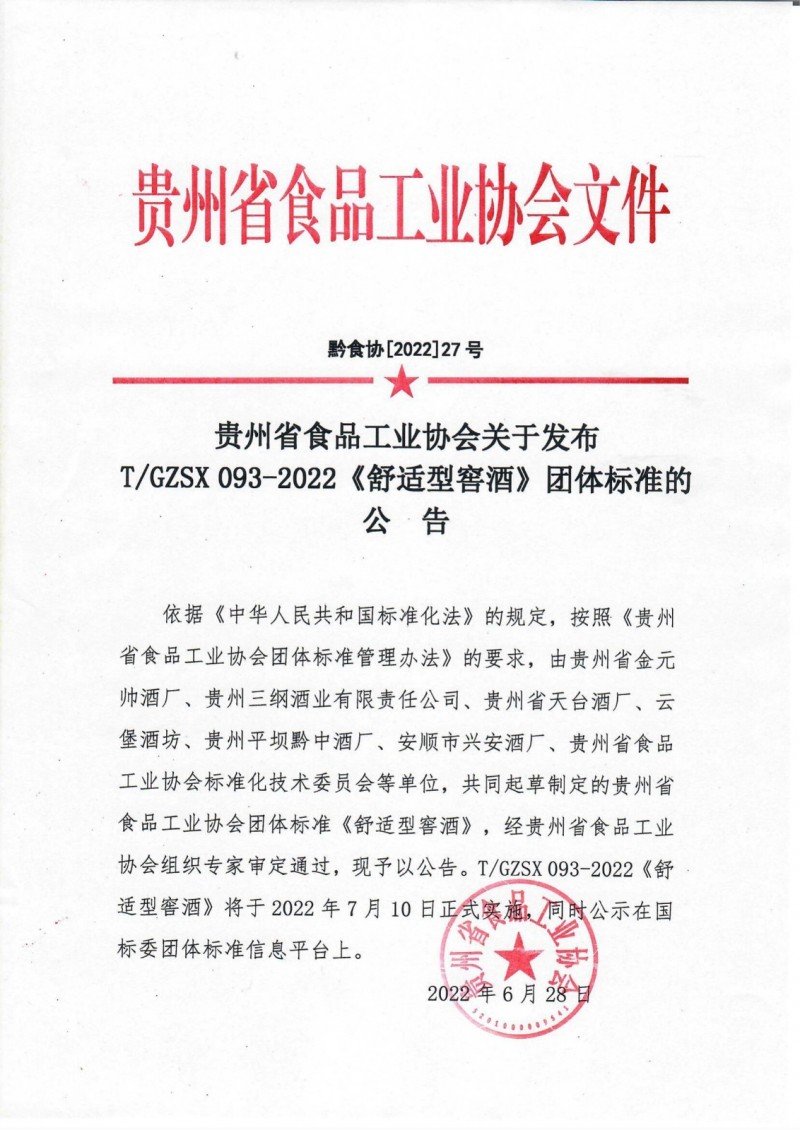 依據《中華人民共和國標準化法》的規定,按照《貴州省食品工業協會團體標準管理辦法》的要求,由貴州省金元帥酒廠、貴州三綱酒業有限責任公司、貴州省天臺酒廠、云堡酒坊、貴州平壩黔中酒廠、安順市興安酒廠、貴州省食品工業協會標準化技術委員會等單位,共同起草制定的貴州省食品工業協會團體標準《舒適型窖酒》,經貴州省食品工業協會組織專家審定通過,現予以公告。T/GZSX093-2022《舒適型窖酒》將于2022年7月10日正式實施,同時公示在國標委團體標準信息平臺上。