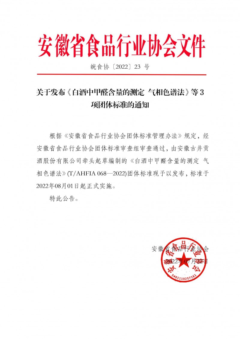 以上為安徽省食品行業協會關于發布《白酒中甲醛含量的測定 氣相色譜法》等3項團體標準的通知(皖食協〔2022〕23號)的檢測服務介紹,如有其他疑問可聯系在線工程師!