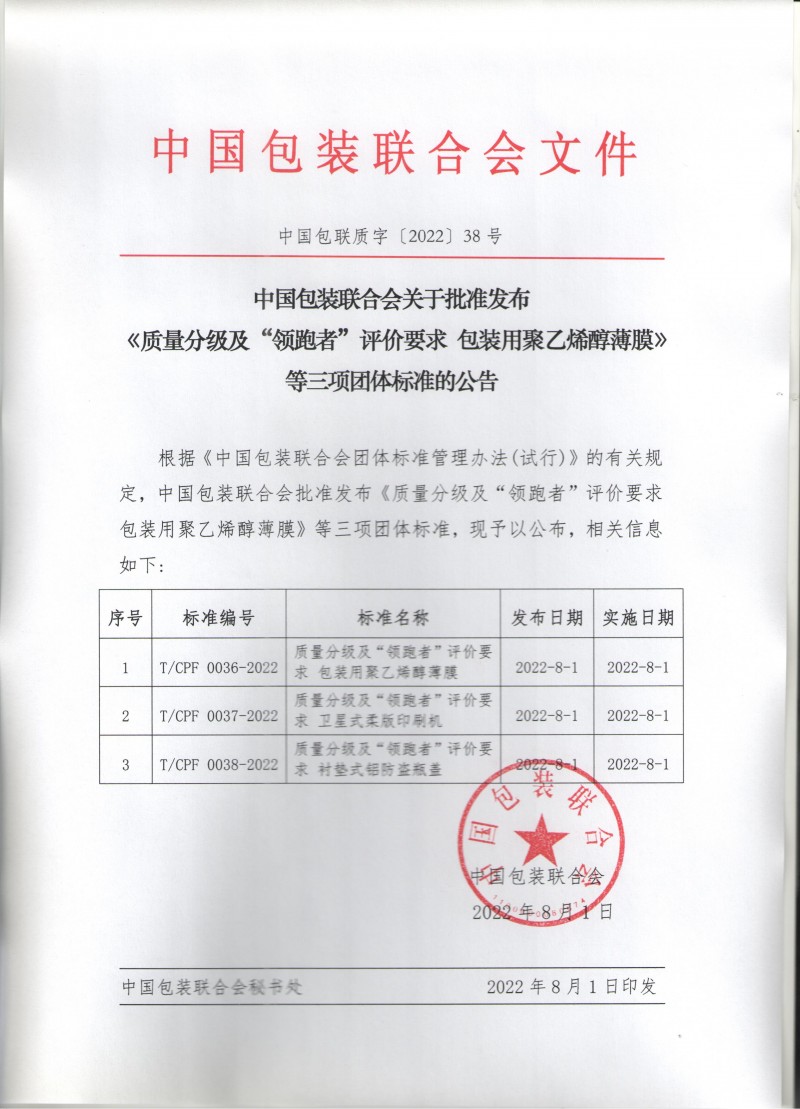 T/CPF 0036-2022 質(zhì)量分級(jí)及“領(lǐng)跑者”評(píng)價(jià)要求 包裝用聚乙烯醇薄膜 T/CPF 0038-2022 質(zhì)量分級(jí)及“領(lǐng)跑者”評(píng)價(jià)要求 襯墊式鋁防盜瓶蓋