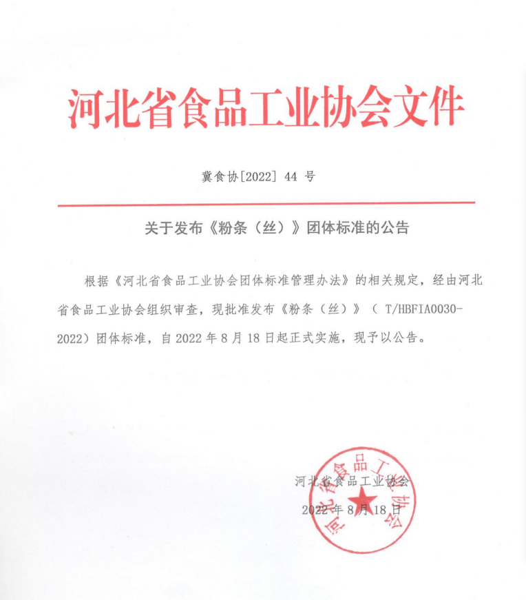 根據《河北省食品工業協會團體標準管理辦法》的相關規定,經由河北省食品工業協會組織審查,現批準發布《粉條(絲)》(T/HBFIA 0030-2022)團體標準,自2022年8月18日起正式實施,現予以公告。