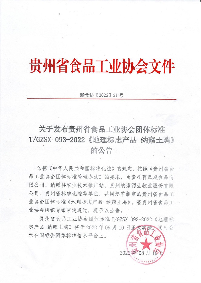 依據《中華人民共和國標準化法》的規定,按照《貴州省食品工業協會團體標準管理辦法》的要求,由貴州百鳳庭食品有限公司、納雍縣農業技術推廣站、貴州納雍源生牧業股份有限公司、貴州省標準化院等單位,共同起草制定的貴州省食品工業協會團體標準《地理標志產品 納雍土雞》,經貴州省食品工業協會組織專家審定通過,現予以公告。