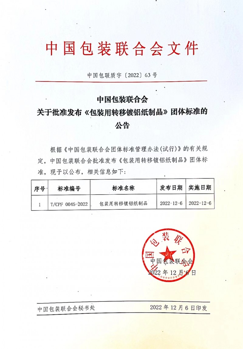 以上為中國包裝聯(lián)合會關于批準發(fā)布《包裝用轉移鍍鋁紙制品》團體標準的公告(中國包聯(lián)質字[2022]63號)的檢測服務介紹,如有其他疑問可聯(lián)系在線工程師!
