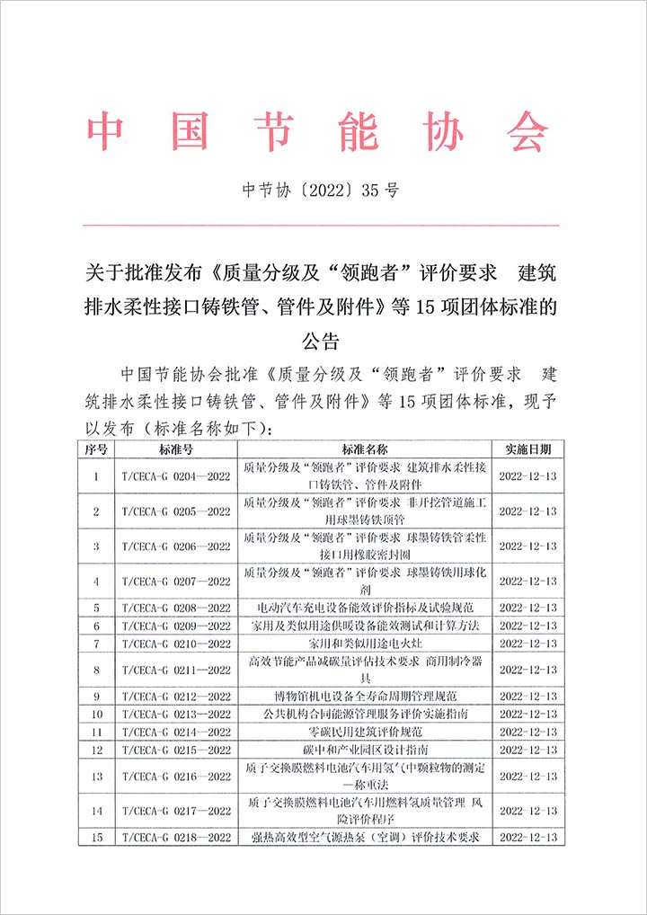 以上為中國節能協會關于批準發布《質量分級及“領跑者”評價要求 建筑排水柔性接口鑄鐵管、管件及附件》等15項團體標準的公告(中節協[2022]35號)的檢測服務介紹,如有其他疑問可聯系在線工程師!