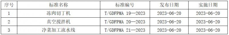 根據(jù)《廣東省食品和包裝機械行業(yè)協(xié)會團體標(biāo)準(zhǔn)制定程序》有關(guān)規(guī)定,由廣東志偉妙卓智能機械制造有限公司牽頭起草的《凍肉切丁機》、《真空攪拌機》和《凈菜加工流水線》3項團體標(biāo)準(zhǔn),已通過專家組審查,現(xiàn)予批準(zhǔn)發(fā)布,標(biāo)準(zhǔn)相關(guān)信息如下: