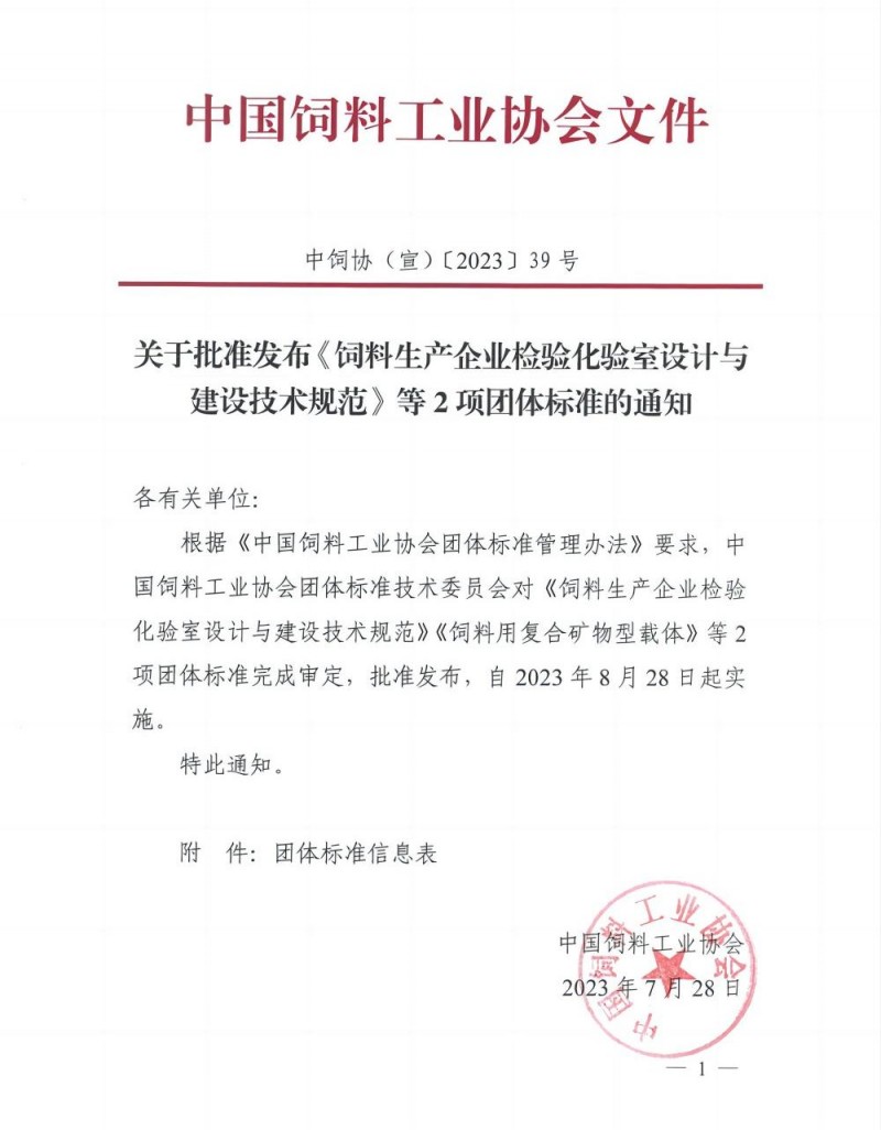 關于批準發布《飼料生產企業檢驗化驗室設計與建設技術規范》等2項團體標準的通知.pdf