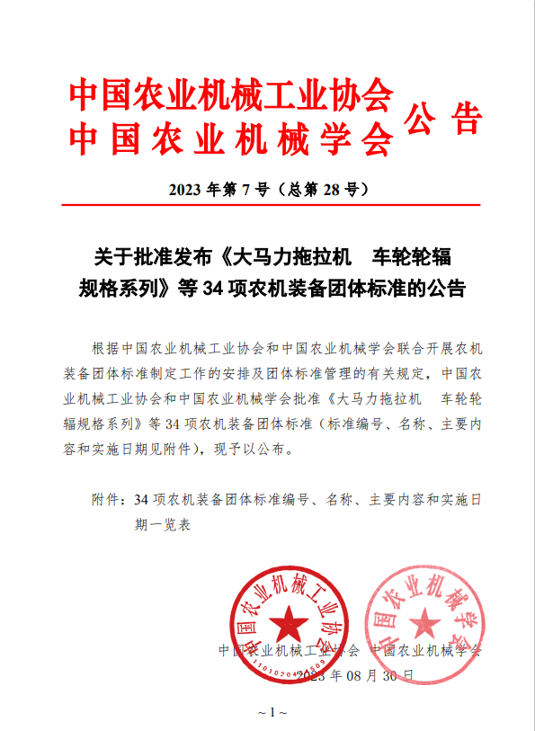 中國農業機械工業協會關于批準發布《大馬力拖拉機 車輪輪輻規格系列》等34項農機裝備團體標準的公告(2023年第7號(總第28號))