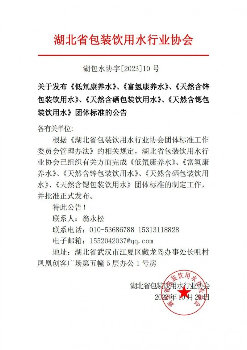 以上為湖北省包裝飲用水行業協會關于發布《低氘康養水》、《富氫康養水》、《天然含鋅包裝飲用水》、《天然含硒包裝飲用水》、《天然含鍶包裝飲用水》團體標準的公告(湖包水協字[2023]10號)的檢測服務介紹,如有其他疑問可聯系在線工程師!