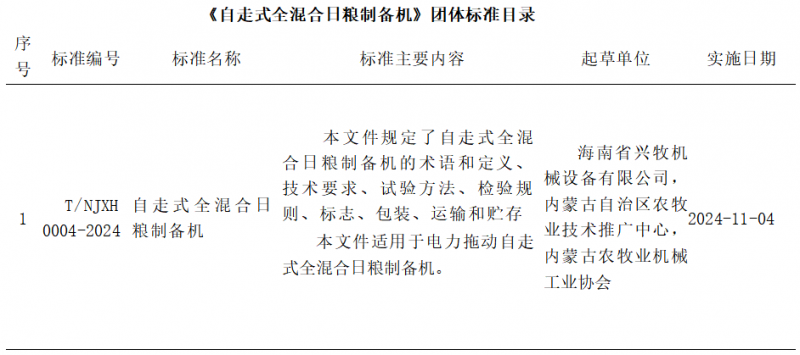 根據(jù)《內(nèi)蒙古農(nóng)牧業(yè)機(jī)械工業(yè)協(xié)會團(tuán)體標(biāo)準(zhǔn)管理辦法(暫行)》相關(guān)規(guī)定,現(xiàn)批準(zhǔn)《自走式全混合日糧制備機(jī)》標(biāo)準(zhǔn)(見附件)為內(nèi)蒙古農(nóng)牧業(yè)機(jī)械工業(yè)協(xié)會團(tuán)體標(biāo)準(zhǔn)。以上標(biāo)準(zhǔn)自2024年11月4日發(fā)布并實(shí)施。