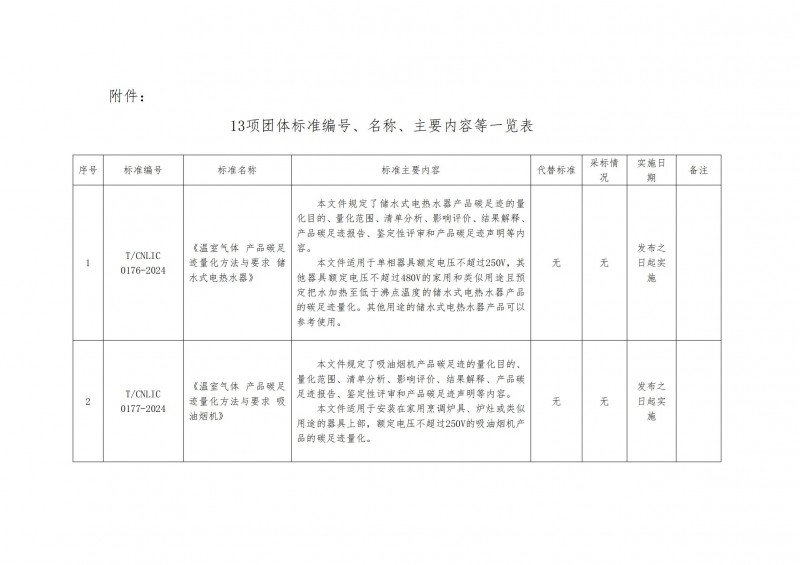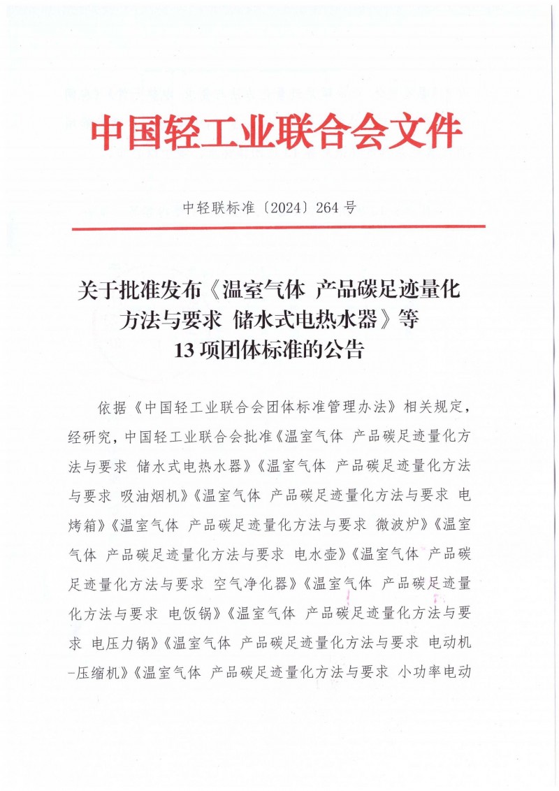 1、關于批準發布《溫室氣體 產品碳足跡量化方法與要求 儲水式電熱水器》等13項團體標準的公告